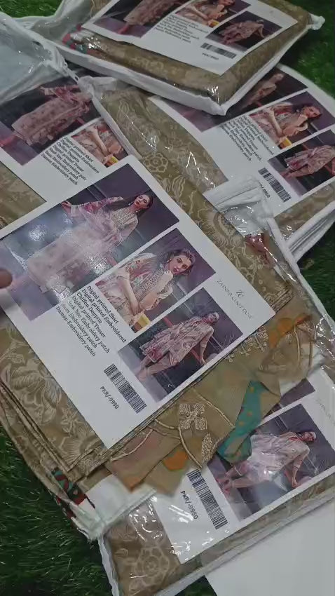 3PC : emb shirt   with  PATCHES printed trouser  with  ready to wear shiffon  dopatta