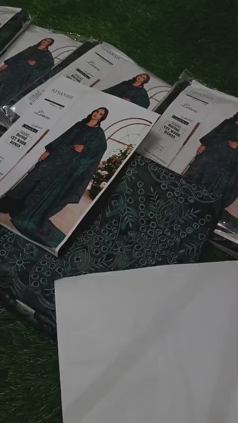 3pc:Emb chicken Kari shirt prlain trouser +linen printed dopatta