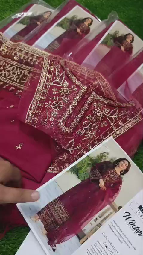3pc:Emb shirt with patches plain trouser +dhanak wool emb shawl