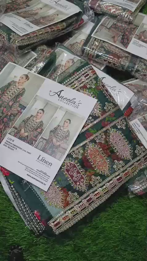 3pc: allover shirt trouser with patches+ linen ready to wear dopatta