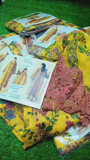 L3pc:printed shirt with patches printed trouser +shifoon ready to wear corner emb dopatta