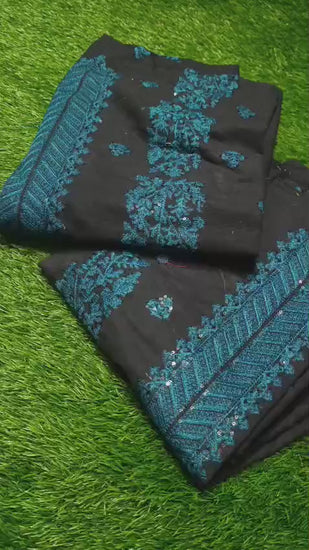 3pc:Emb sequence shirt plain trouser +emb dopatta