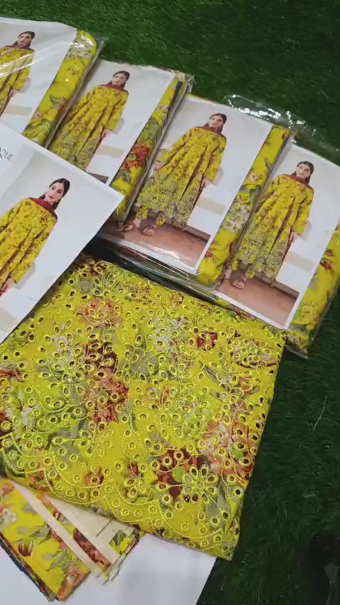 3pc:Emb chicken Kari shirt prlain trouser +linen printed dopatta