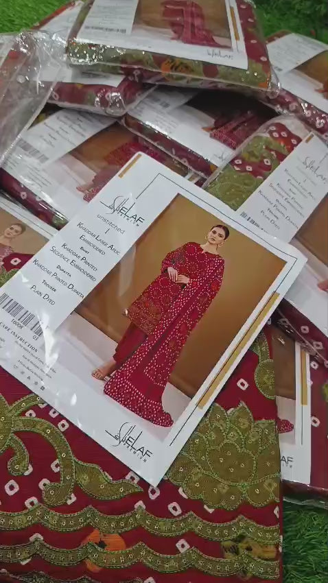 3pc:Emb applic work shirt printed trouser +khaddar printed dopatta
