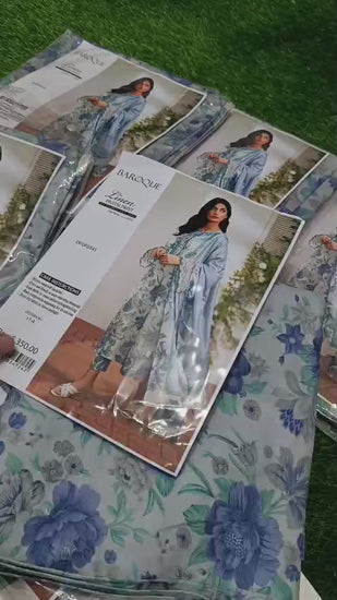 3pc:Emb chicken Kari shirt prlain trouser +linen printed dopatta