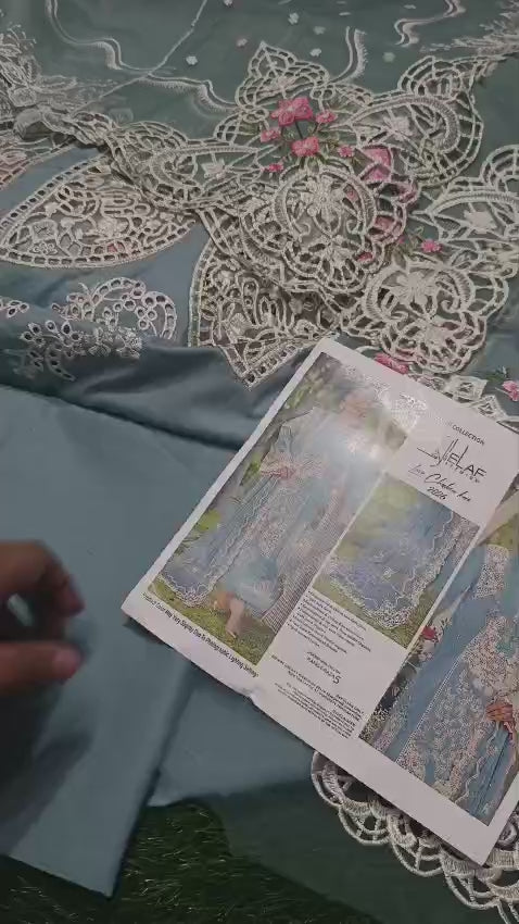 3pc:emb laser work shirt plain trouser +khaddi net emb ready to wear dopatta