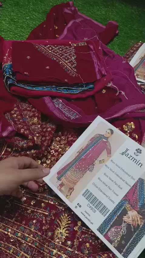 3pc: velvet emb shirt + plain velvet trouser + shifoon emb sequence dopatta with silk patti