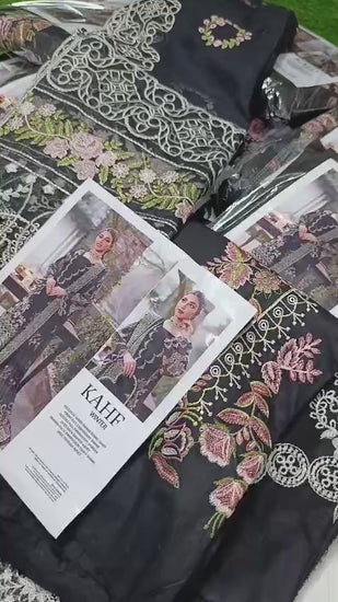 3pc:emb chicken kari shirt with patches plain trouser +Shifoon emb ready to wear dopatta