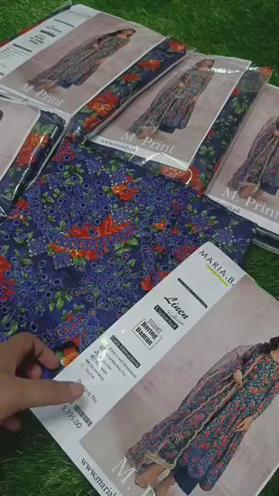 3pc:Emb chicken Kari shirt plain trouser +linen printed dopatta