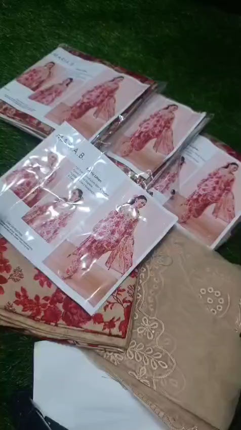 3pc:Emb chicken Kari shirt prlain trouser +linen printed dopatta
