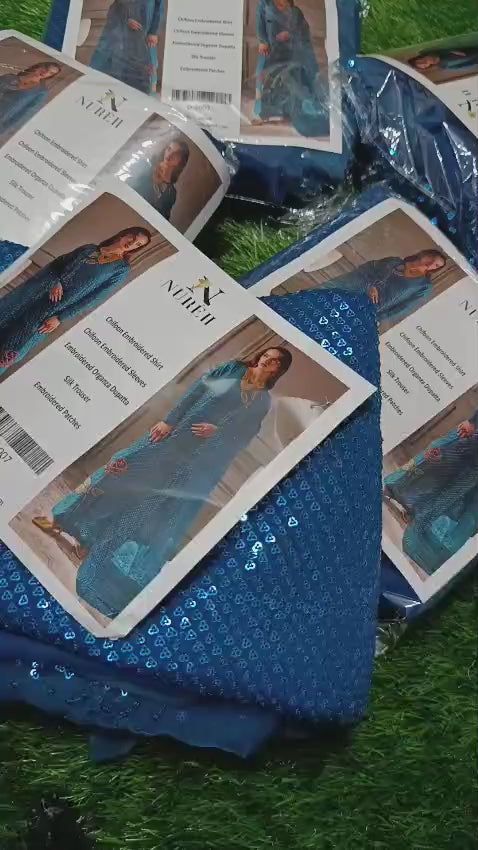 3pc: Emb sequence shirt + plain silk trouser +organza emb sequence dopatta